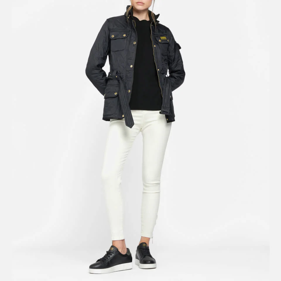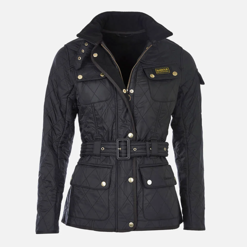 - Buckled stand collar, designer logo, four patch pockets, diamond quilting, belted waist, signature press studs, fleece lining