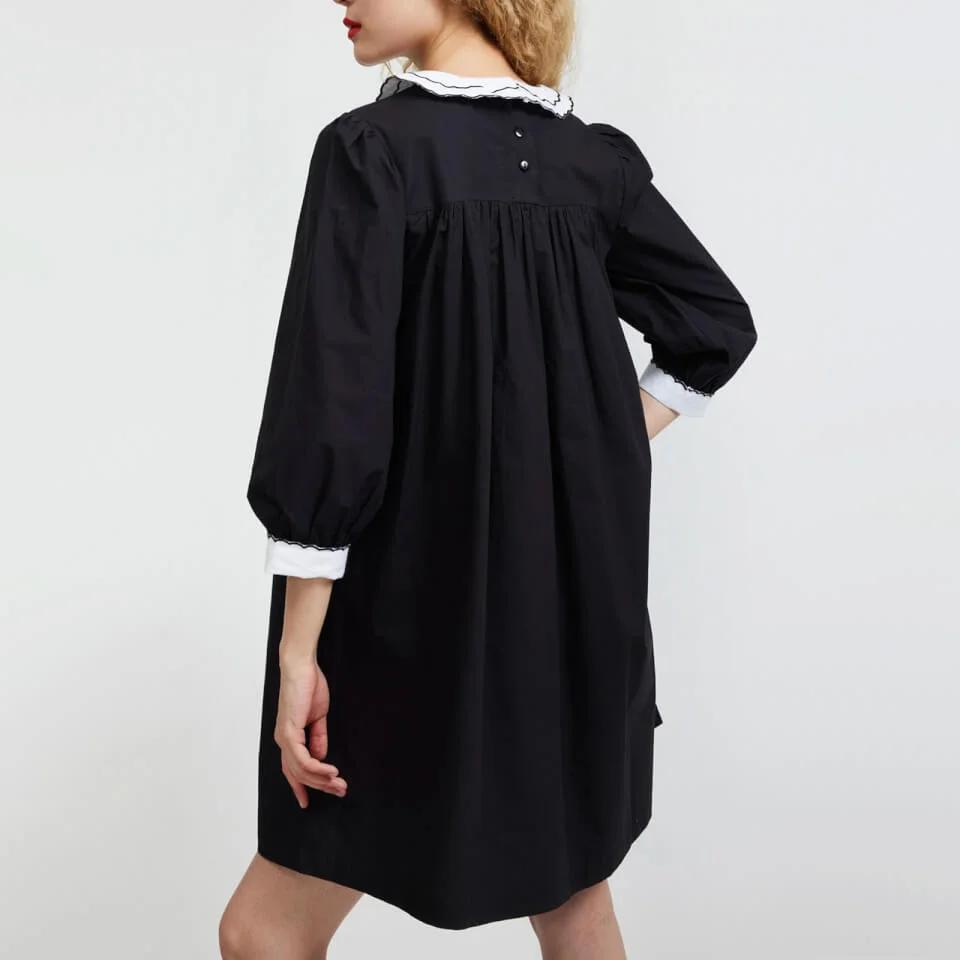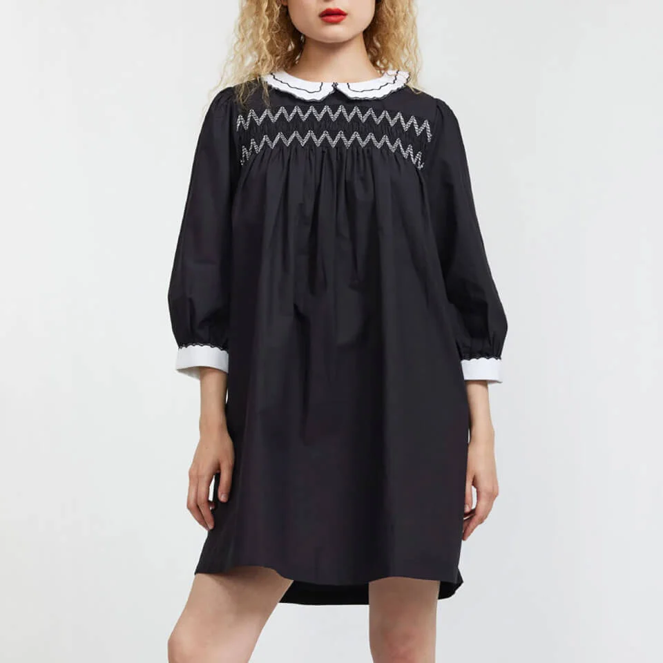 - Peter Pan collar, scalloped embroidery zigzag smocking, two side slant pockets, puffed sleeves with cuffs