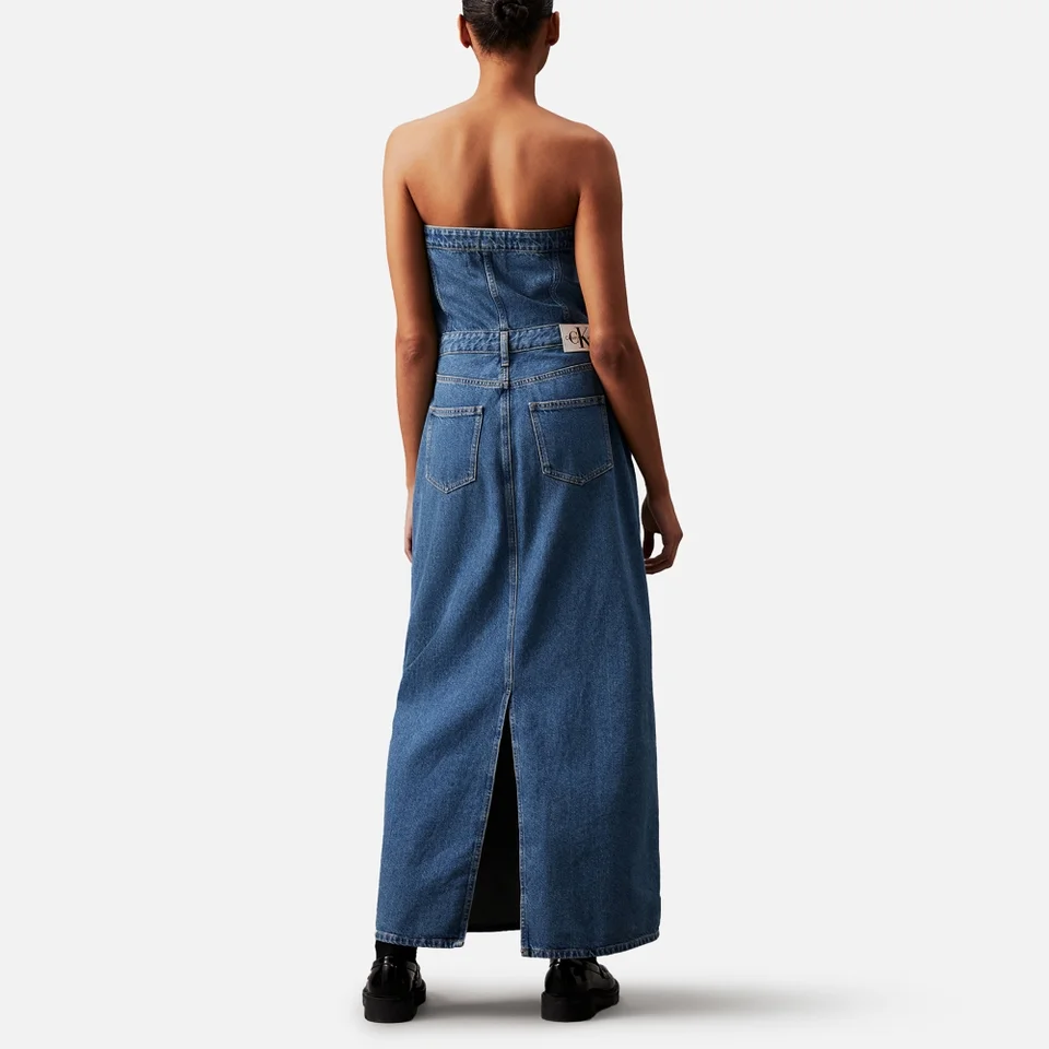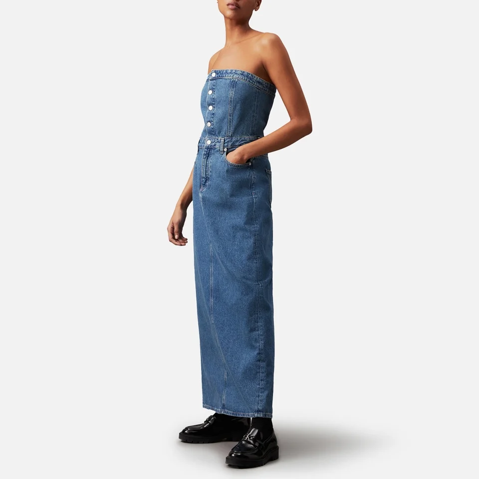 - Strapless, belt loops, five pockets, button detailing, branded logo