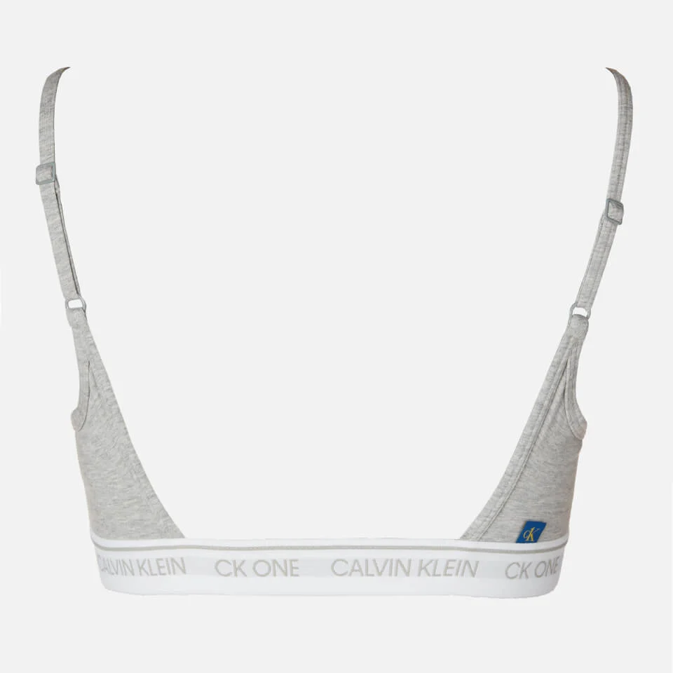 Grey unlined bralette for women from Calvin Klein. Cotton blend with elastic under band for comfort and support. Open back and adjustable shoulder straps. Signature branding across the band with an additional logo tab to the rear.
