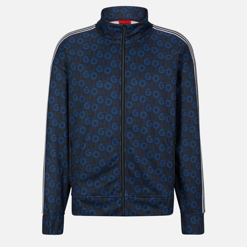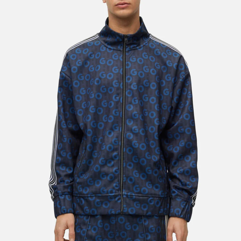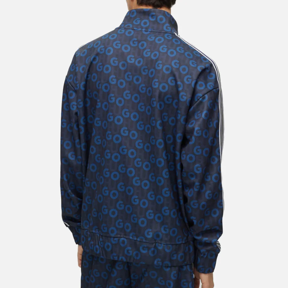 - High neck collar, cuffed sleeves, designer motif, two slip pockets