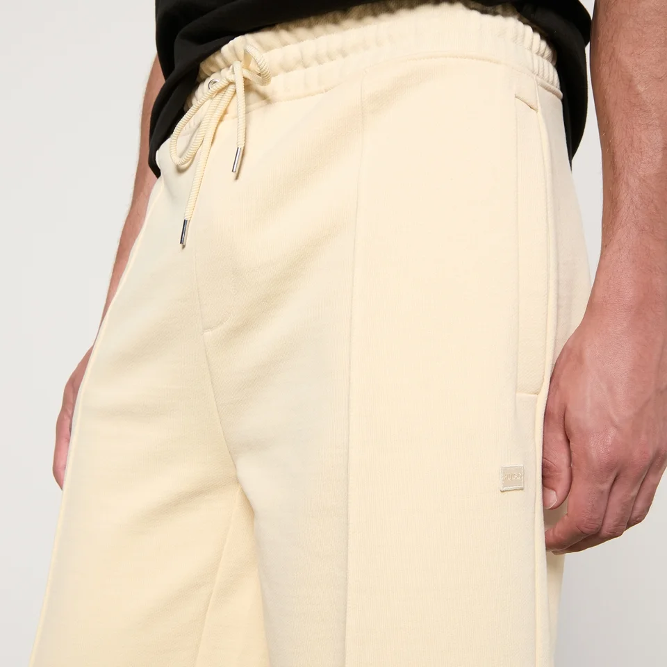 - Elasticated drawcord waistband, designer logo appliqué, pintuck seams, on-seam pockets