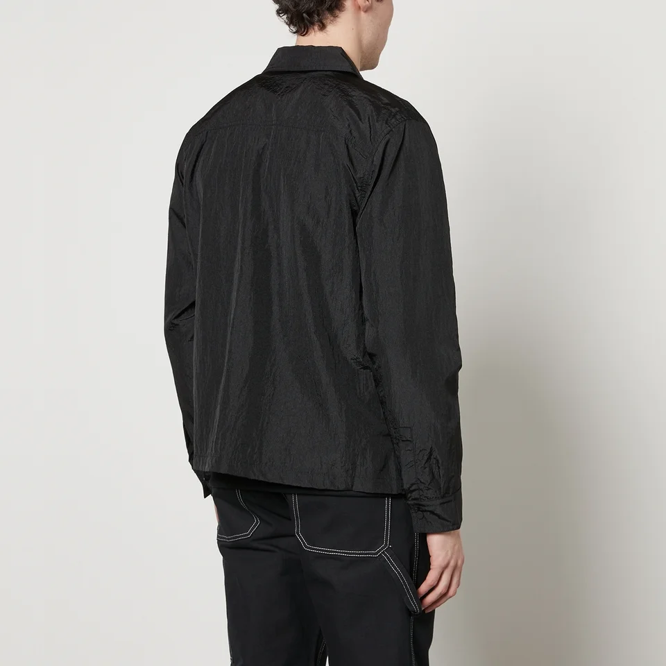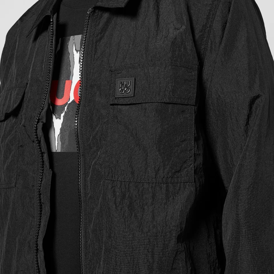 - Snap-fastening cuffs, two chest flap pockets, designer logo plaque, two side slip pockets