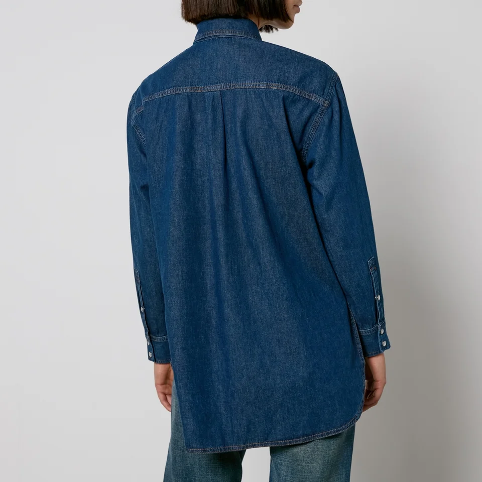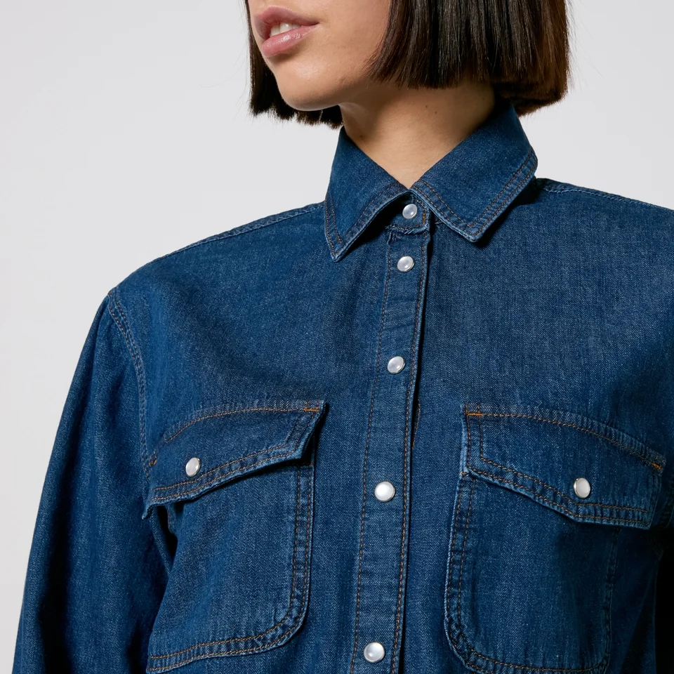 The denim shirt is a timeless design that will lend itself to your casual wardrobe collections for years to come. MAX&Co. adds its touch with its Miriam shirt. Crafted from blue denim, its pearlescent snap fastenings throughout offer a feminine touch. Style yours with white trousers and black loafers.