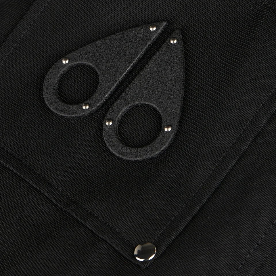 - Detachable hood, high neck, throat latch, designer logo plaque, side welt pockets, front slant pockets, ribbed-knit trims