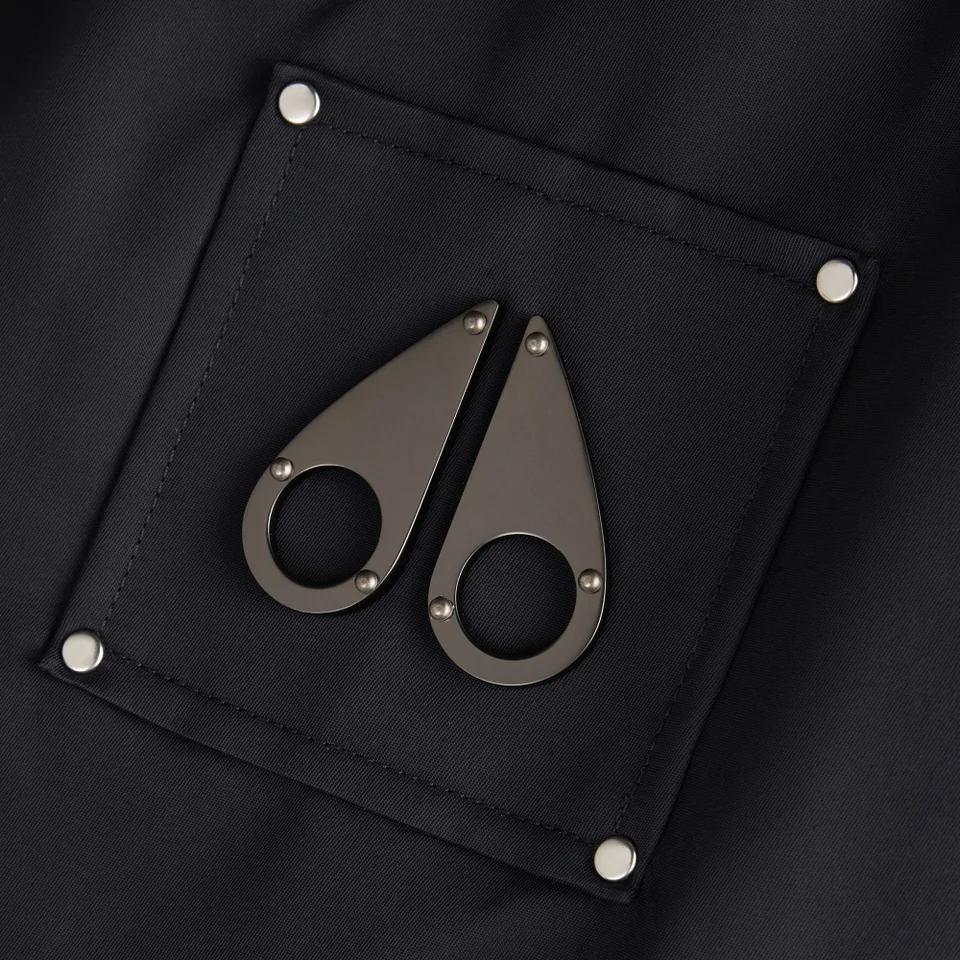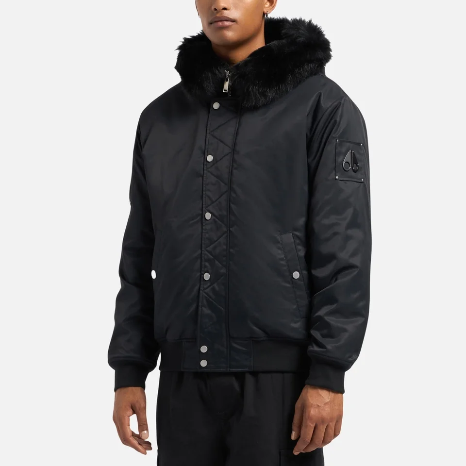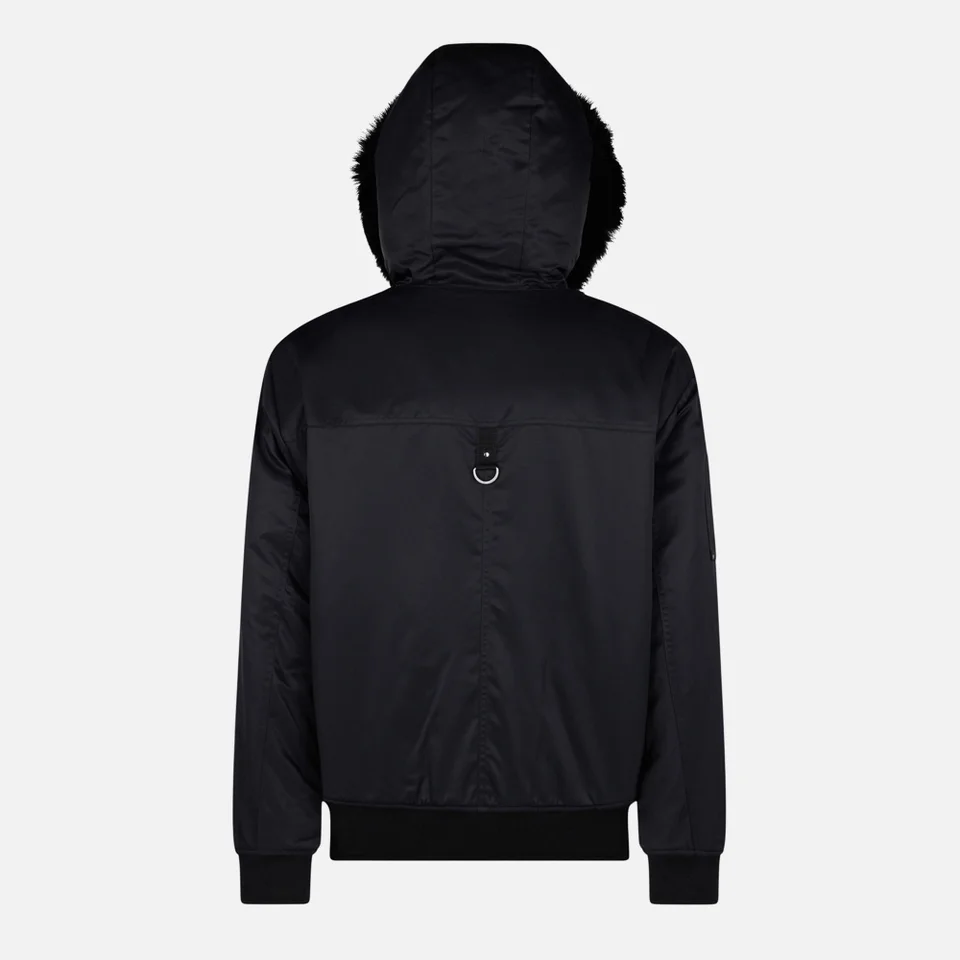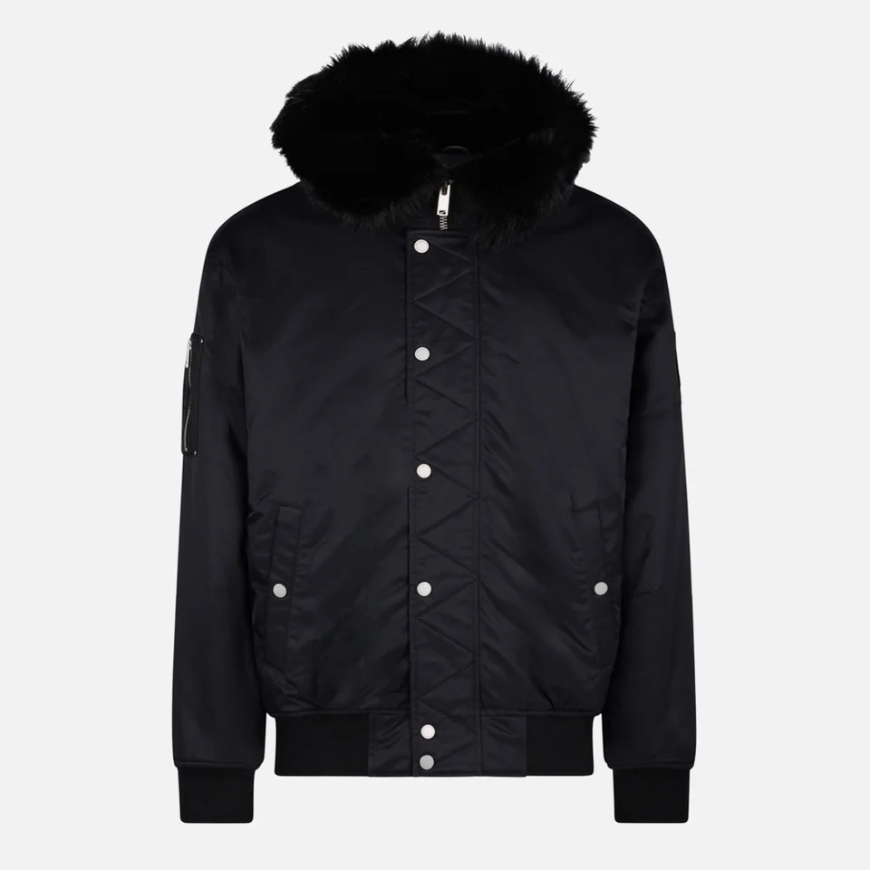 - Shearling hood trim, designer logo plaque, buttoned welt pockets