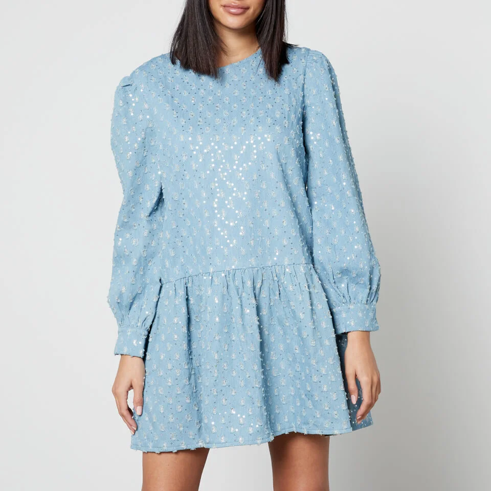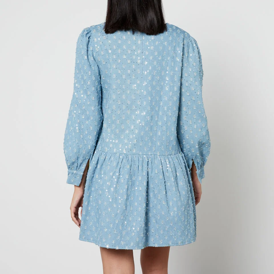 Blurring the boundaries between day and eveningwear, the Never Fully Dressed Minnie dress is the perfect transitional piece. Cut from distressed denim with metallic silver flecks and detailed with an all-over sequined design, this sparkling iteration features voluptuous cuffed sleeves, a dropped waistline and a peplum hem.