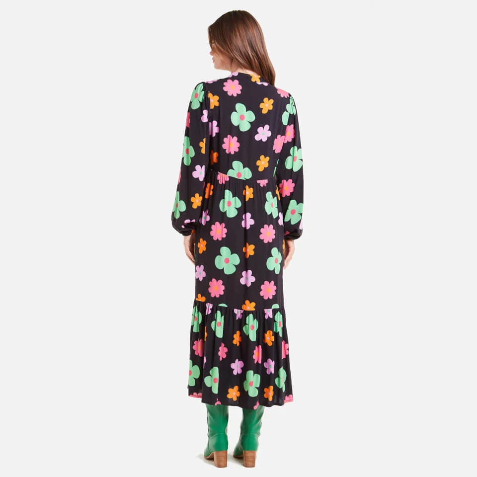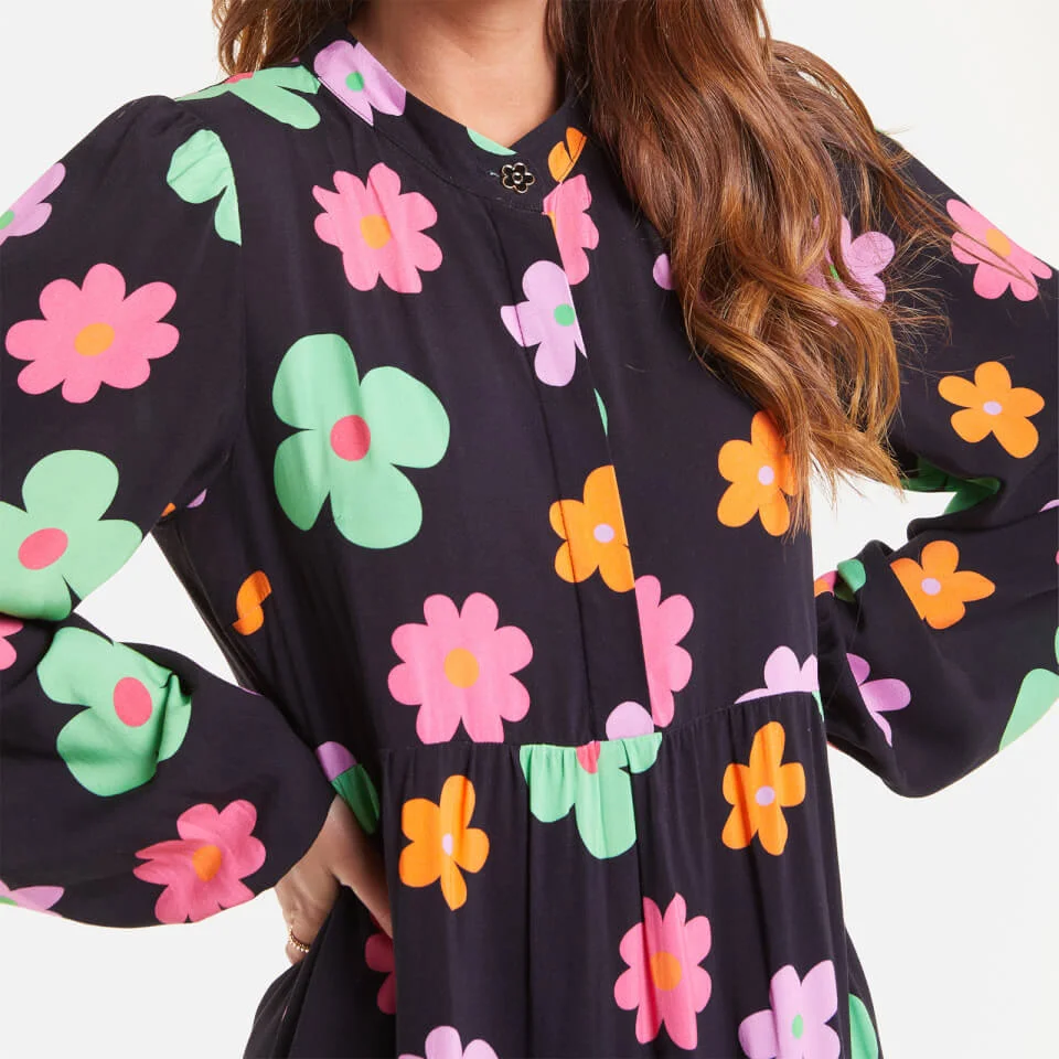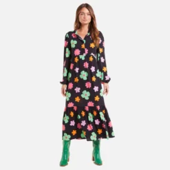 Everything about Never Fully Dressed’s dress is reminiscent of ’70s styles, from the swishy silhouette to the colourful blooms. Made from ECOVEROâ„¢ viscose sourced from responsibly managed forests, it has blouson sleeves and a loose silhouette enhanced with a tiered skirt.