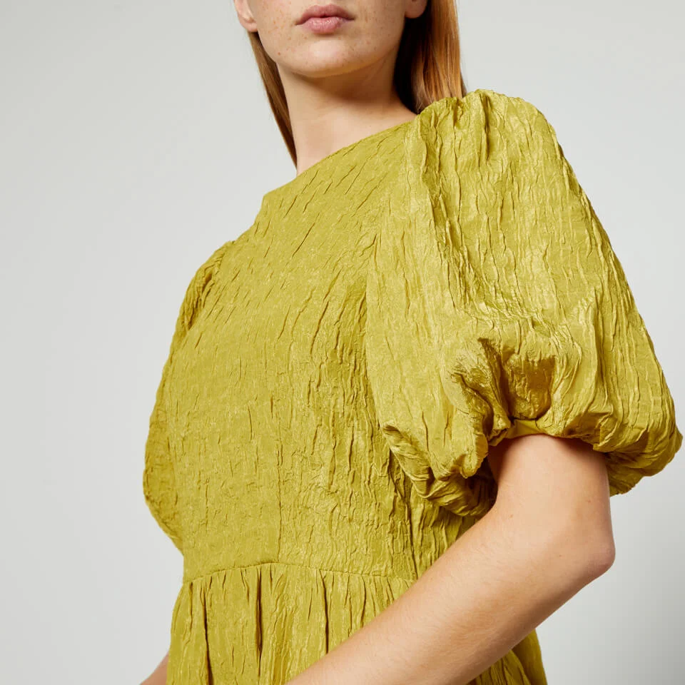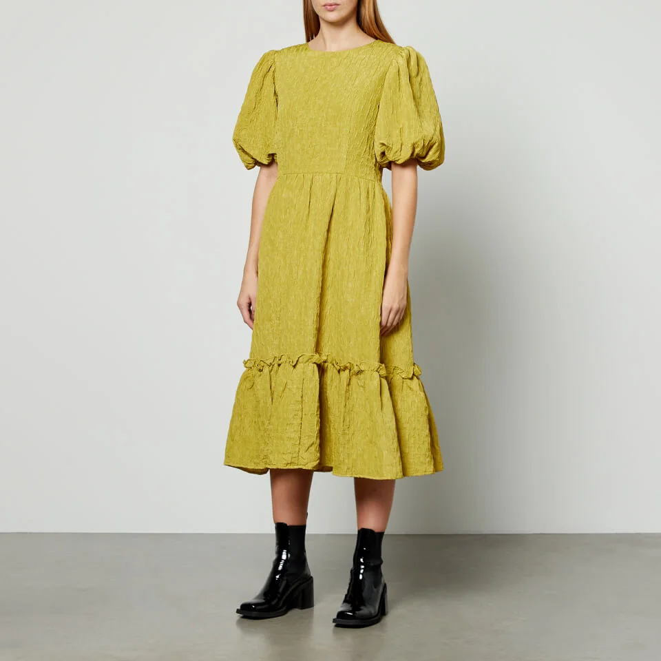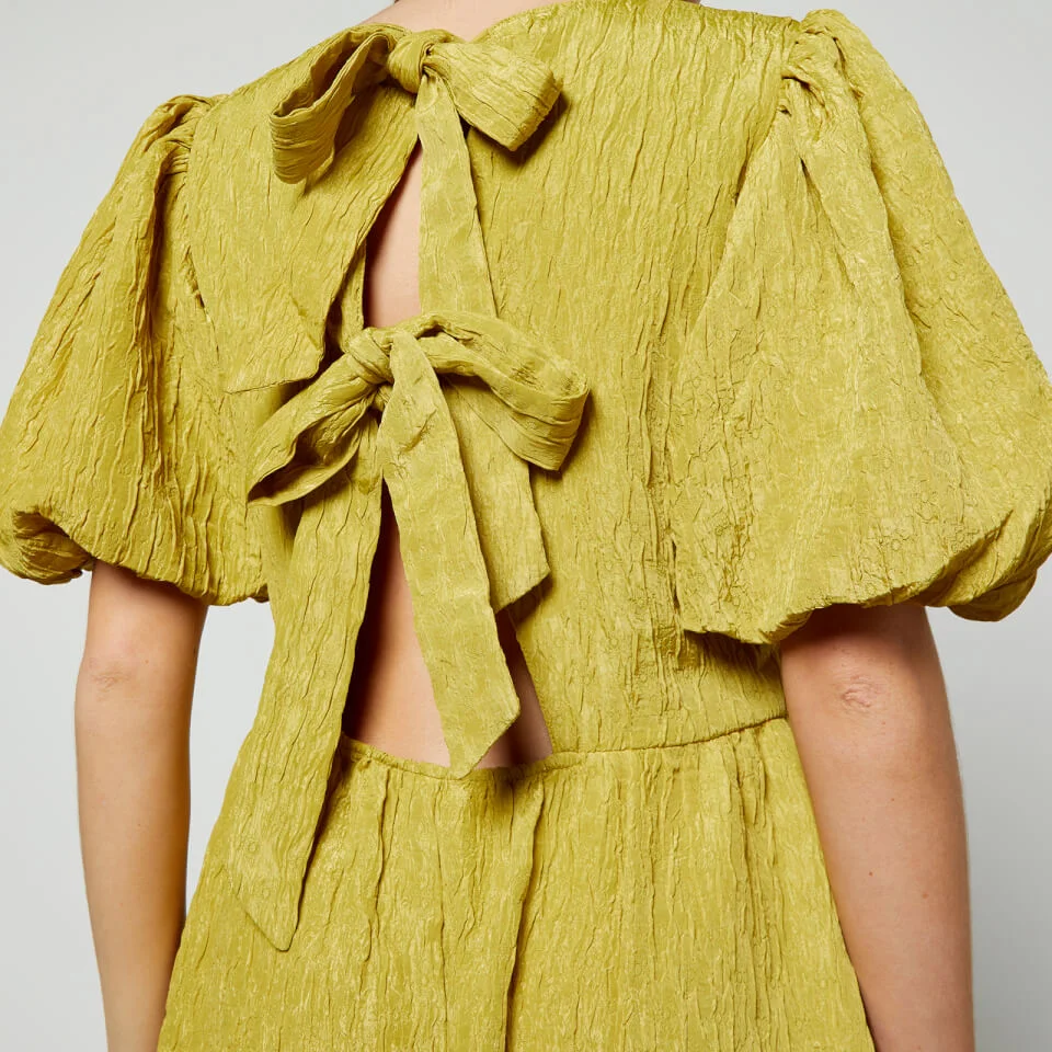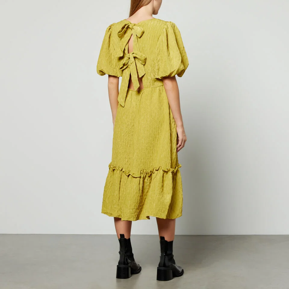 - Balloon sleeves, open back with ties decoration, ruffled hem