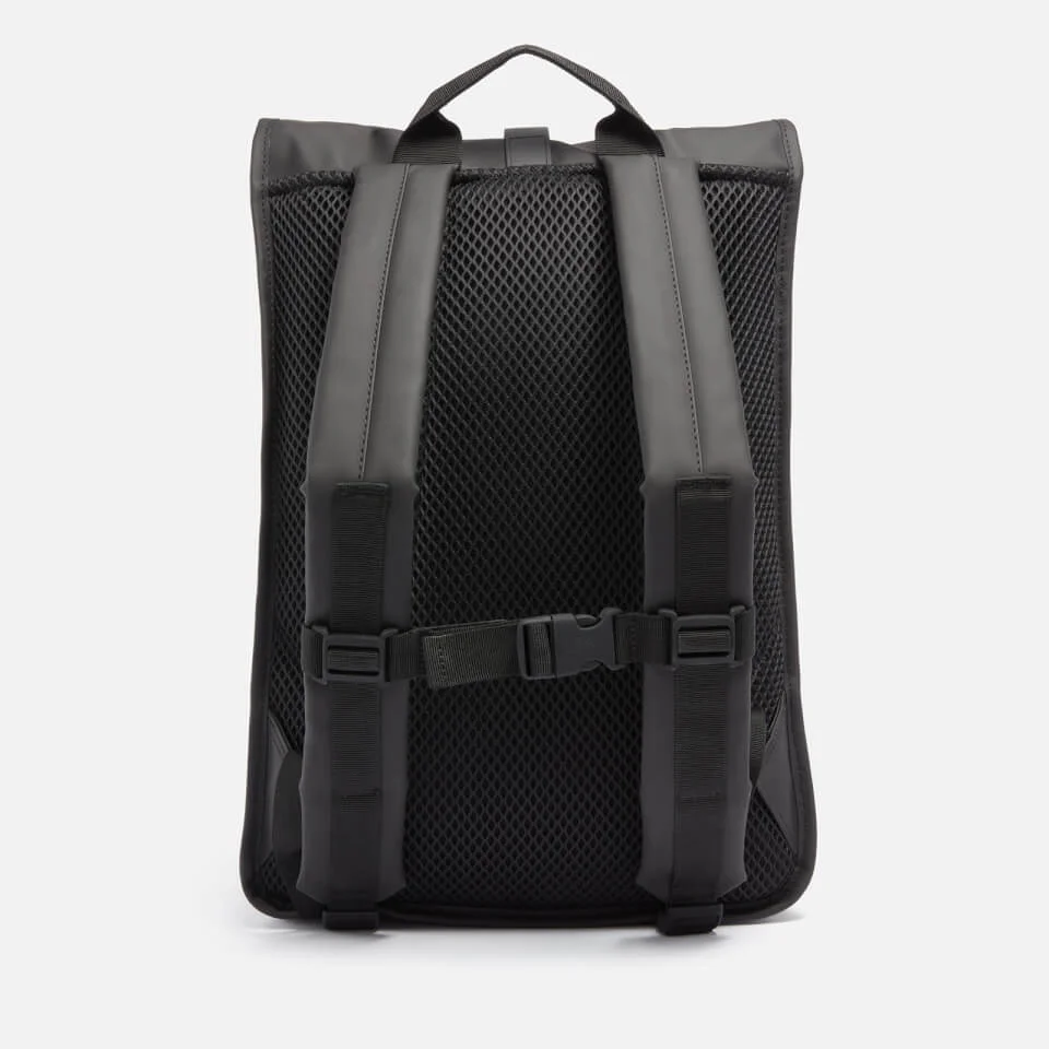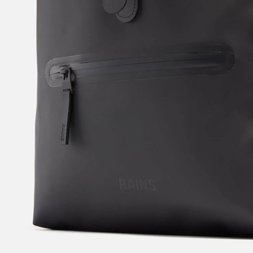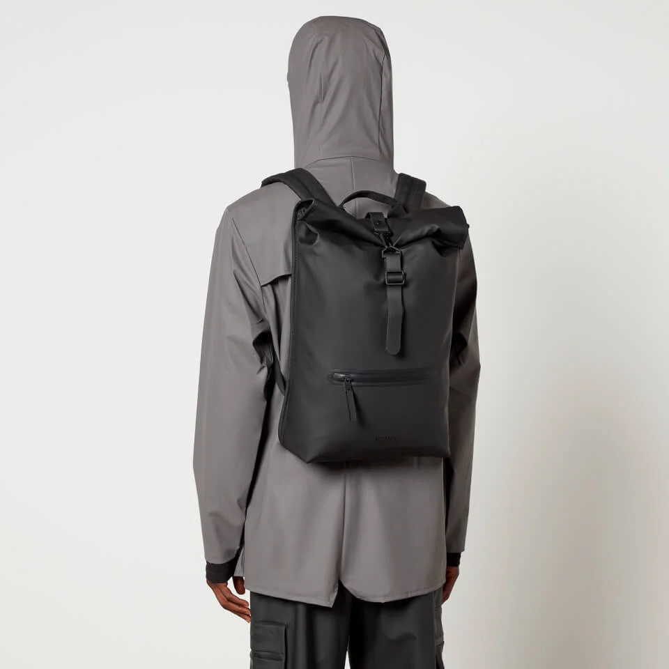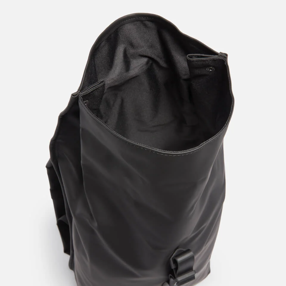 Sleek and practical, Rain’s Rolltop Rucksack is a statement in minimalist design. Dressed in all-black, it features a showerproof matte shell and aqua seal trims for top-notch weather protection. The front zipped pocket keeps essentials within easy reach, while the roomy main compartment effortlessly accommodates all your weekend gear.