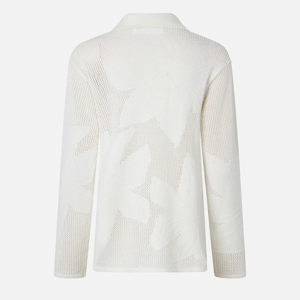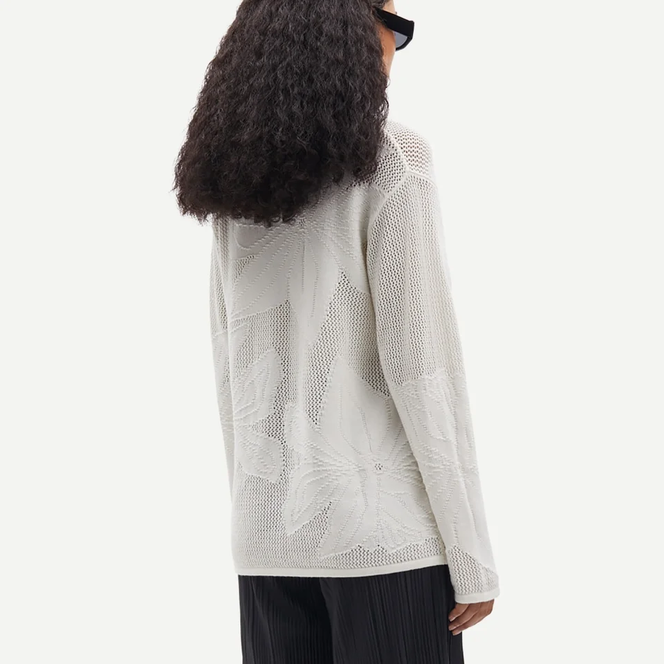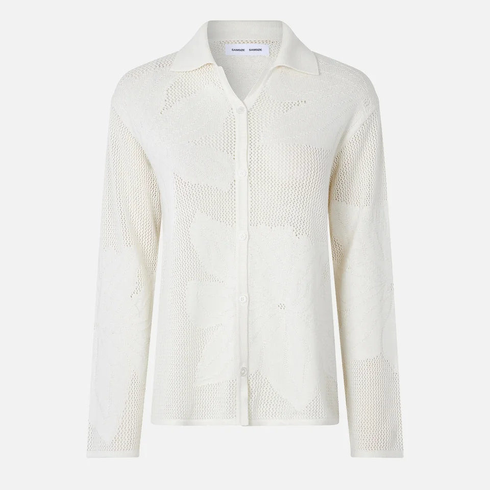Relaxed and feminine, Samsøe Samsøe’s Sacona shirt is knitted with precision, showcasing a floral-jacquard weave. It’s composed of organic cotton and wool-blend. The intricate open-knit design features a spread collar and subtly widened sleeves, transitioning effortlessly through the seasons.