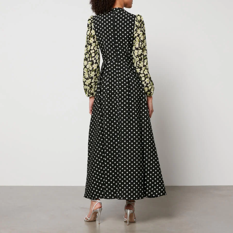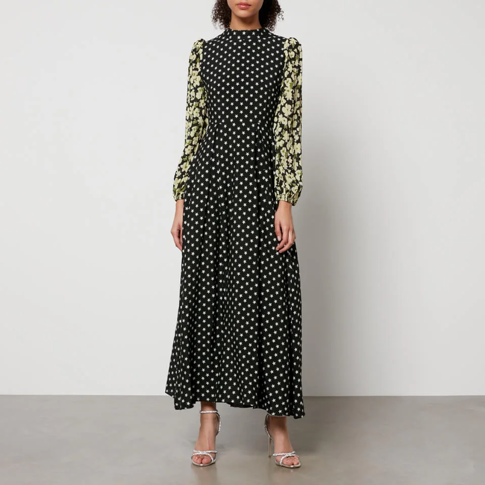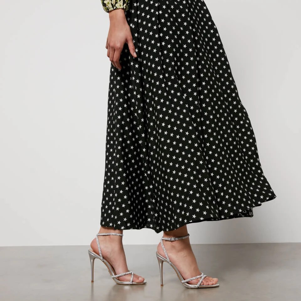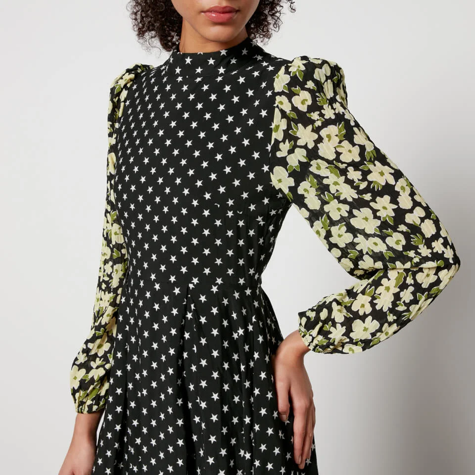 Sister Jane’s Ballad midi dress is meticulously crafted from jacquard and seersucker in contrasting star and floral designs. Its silhouette effortlessly drapes over your figure and has blouson sleeves. Style yours with silver heels and a matching purse.