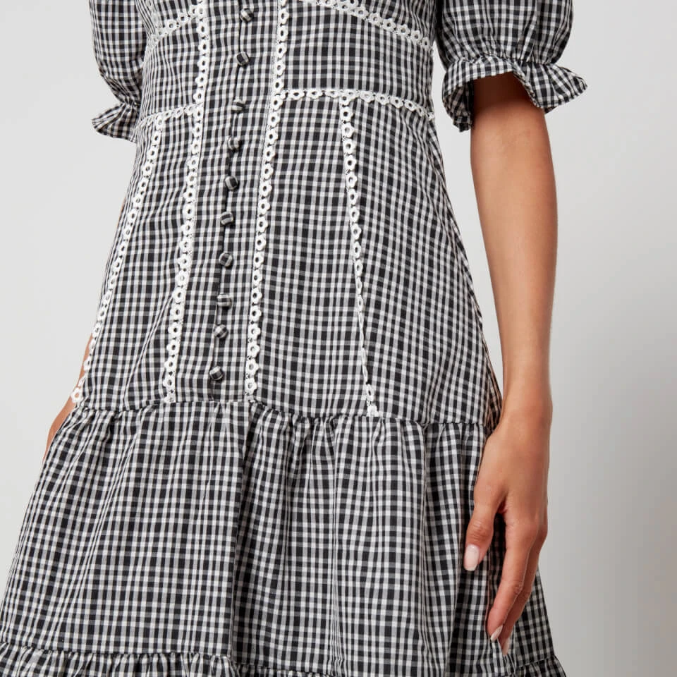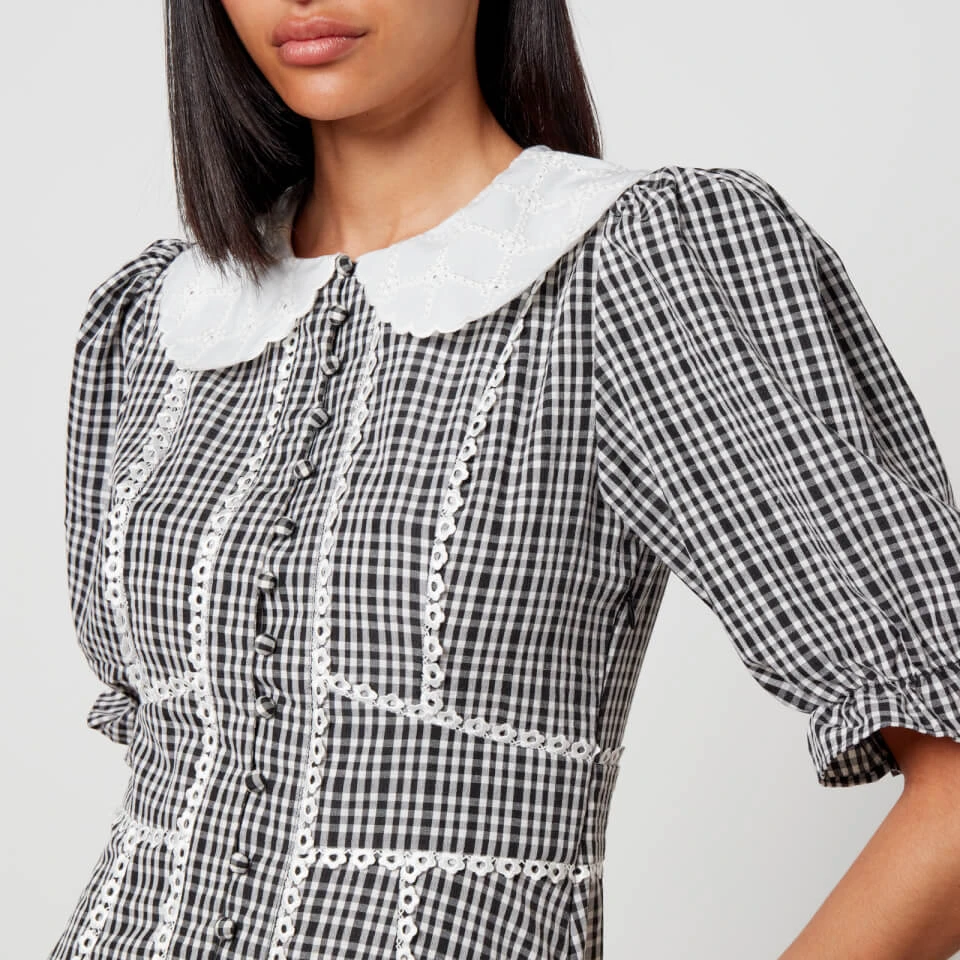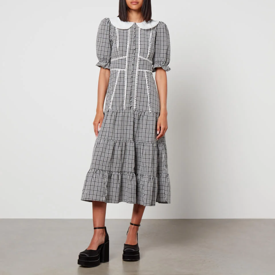 Sister Jane’s Candia gingham midi dress is a quintessential garment for a warm-weather dressing. The Peter Pan collar and scalloped trims create a romantic, summer-inspired style. Style it with ballet pumps and a raffia bag.