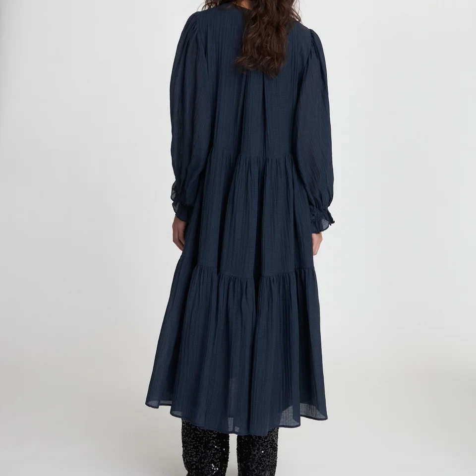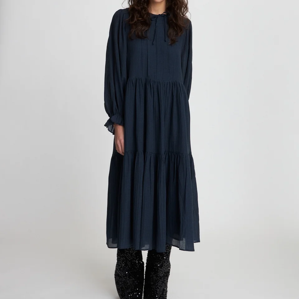 - Bow detail, gathered shoulders, frill cuffs, tiered skirt