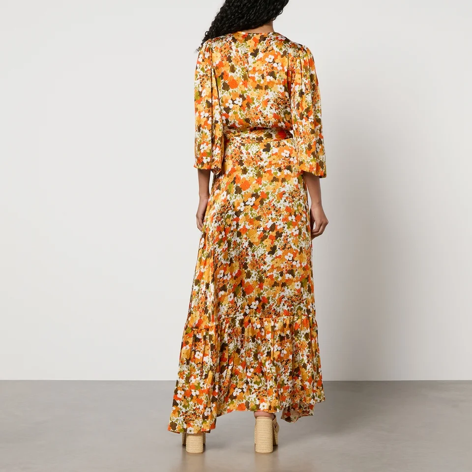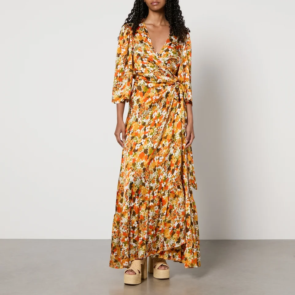 Slip into the summer season in this wrap dress by Stella Nova. Fabricated from a lightweight puckered silk, the tactile piece floats to a maxi length. Short flounce sleeves, gathers at the shoulders and a waist feature come together to add subtle definition to your silhouette.