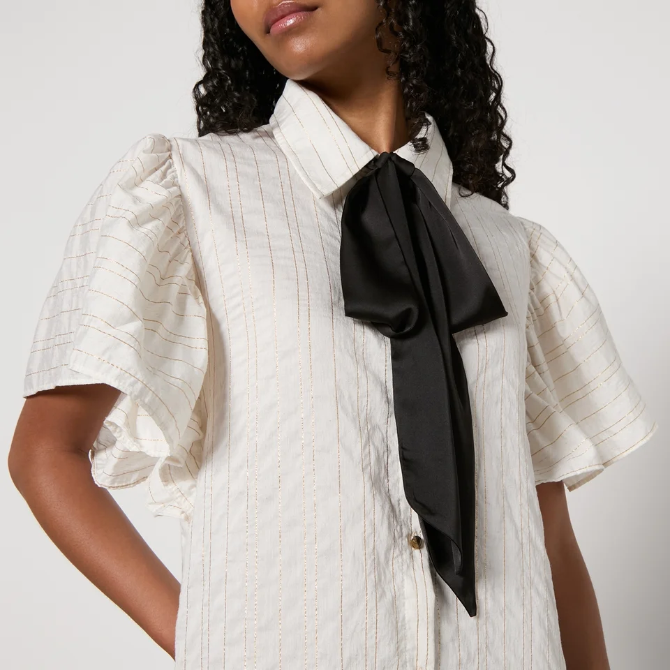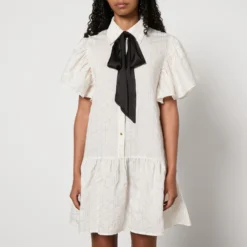Stella Nova dreams up another summery silhouette. Laced with metallic threads, this white mini dress features flouncy sleeves, a dropped hem and contrasting black pussy-bow ties. Style the floaty garment with knee-high boots and a mini bag for a feminine flourish.