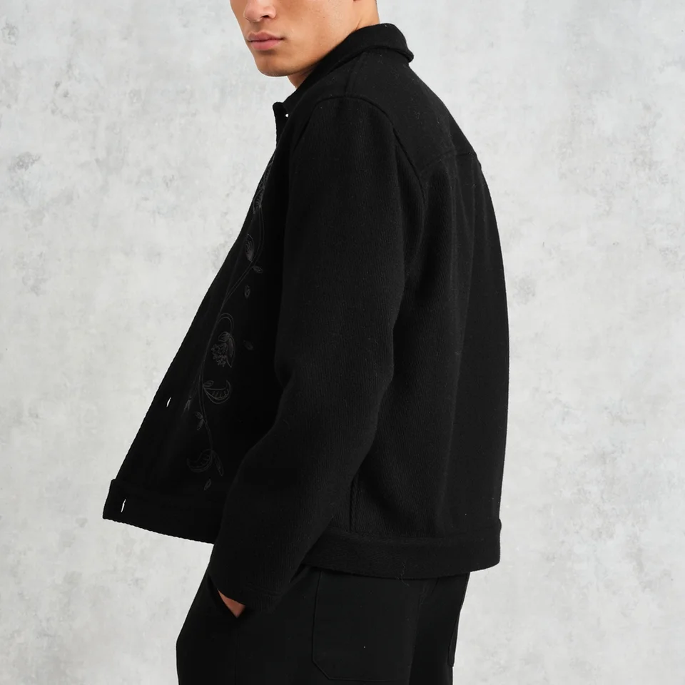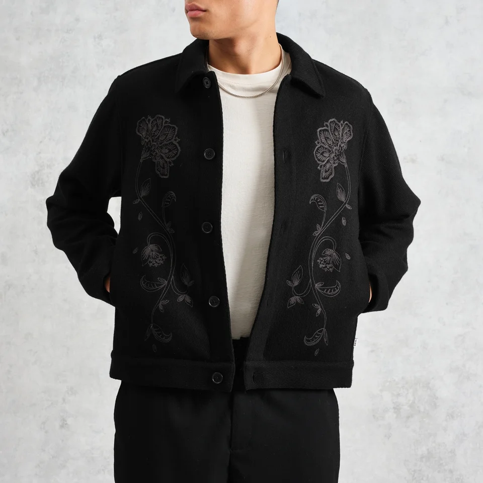 Subtle yet sharp, this Wax London Elm jacket comes in a heavyweight black twill made from a majority wool-blend. It’s nuanced with floral embroidery across the front in contrasting grey threads, showcasing the collection’s focus on patterns. It also features button tabs along the waist for a custom feel.
